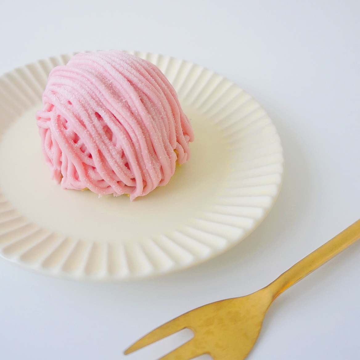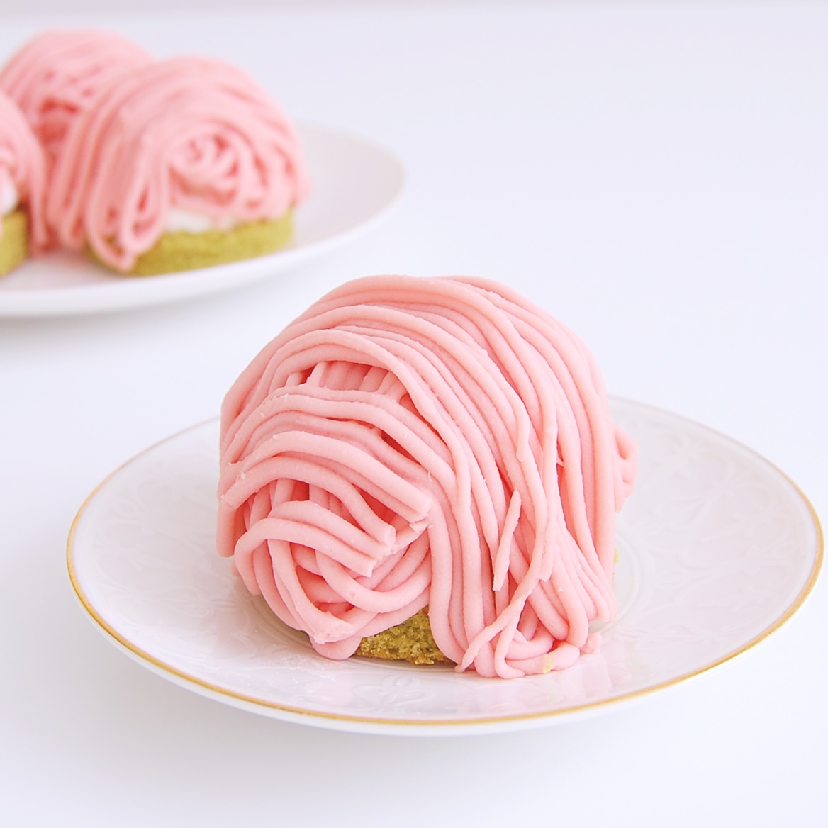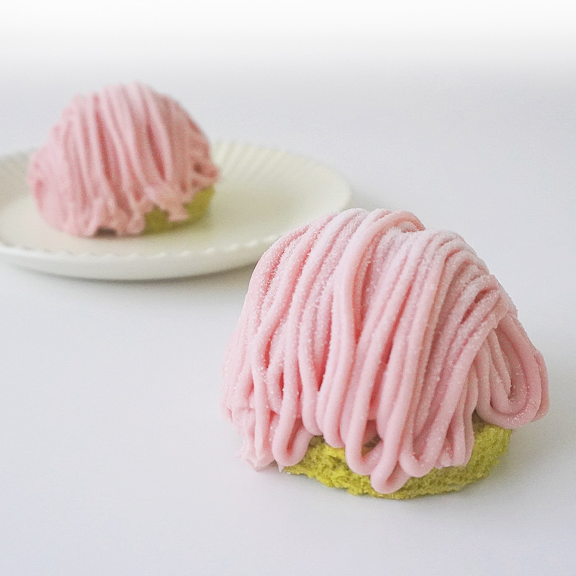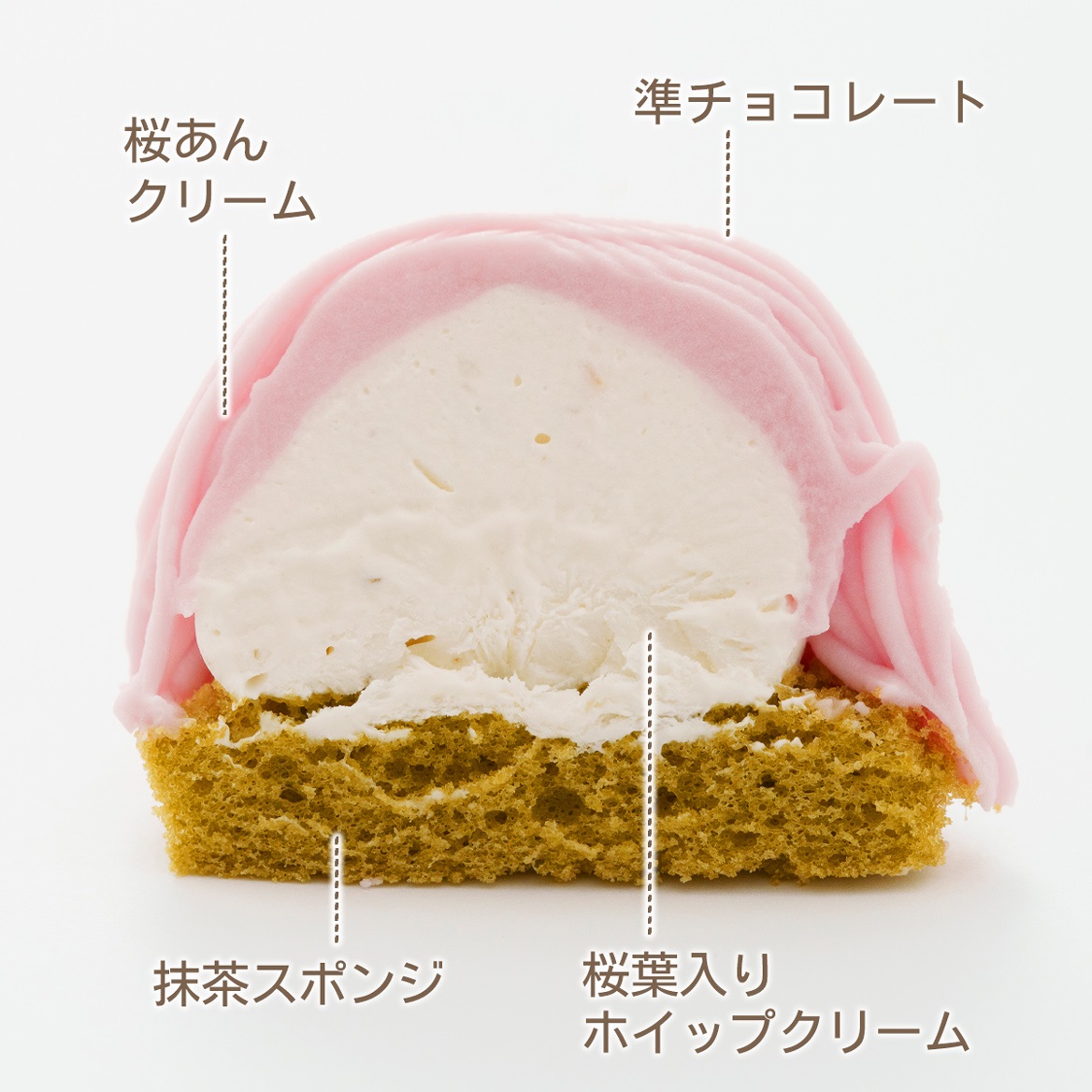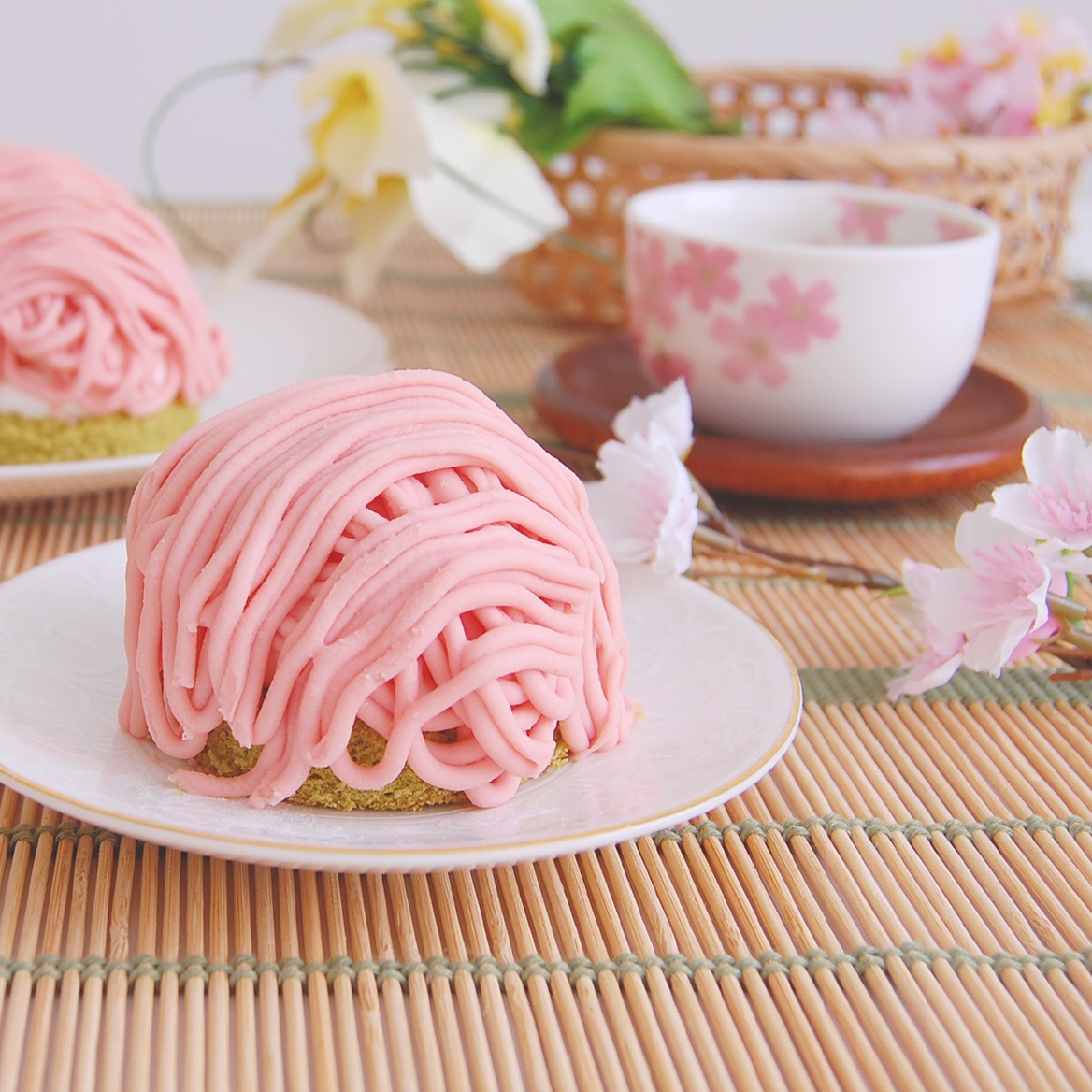 桜ペーストを練りこんだ桜あんクリームの可愛い色のモンブラン。桜が優しく香る和洋折衷な一品です。 抹茶スポンジを敷いて、「桜もち」のような”和スイーツ”に仕上げました。 なめらかなクリームが口の中でほどけ、やさしい桜の風味が広がります。見た目も可愛らしい季節を楽しむデザートに仕上げました。 桜と抹茶の鮮やかな彩りと、口の中で香る桜の風味が、春の訪れを感じさせます。
